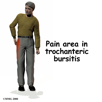 A common spot for bursitis is on the side of the hip. Here a large tendon passes over the bony bump on the side of the hip. The bony bump is called the greater trochanter. Inflammation in the bursa between the tendon and the greater trochanter is called trochanteric bursitis. This problem is common in older individuals. It may also occur in younger patients who are extremely active in exercises such as walking, running, or biking.